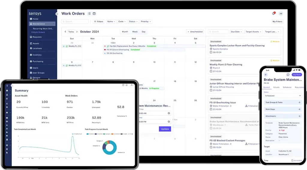 Sensys comes packaged with a pre-built set of analytical dashboards covering crucial KPIs such as total and open work orders, average cycle time, estimated hours, and total maintenance cost, amongst others